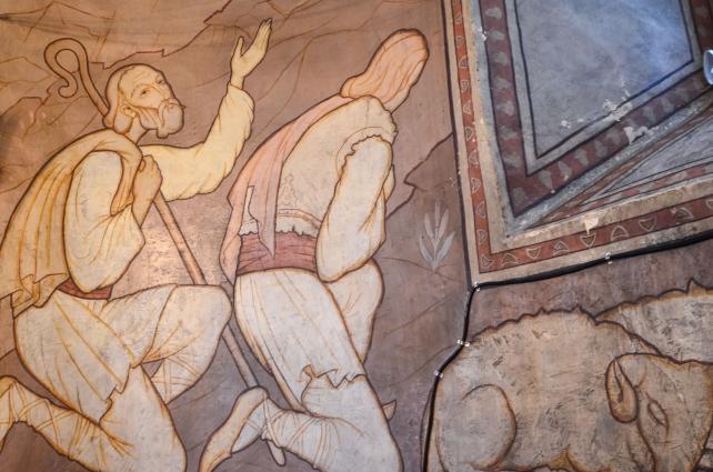 Pridvorul bisericii a fost pictat în 1835 de pictori amatori. Pronaosul, naosul şi altarul au rămas nepictate până în 1935, când, prin strădania doctorului Paul Gotcu şi cu sprijinul credincioşilor, interiorul va fi împodobit cu pictură în ceară, executată de studenţi şi absolvenţi ai Academiei de Arte Frumoase din Iaşi (printre ei şi Corneliu Baba), călăuziţi de dascălul lor, N. Tonitza. Sub îndrumarea maestrului, pictorii umanizează foarte mult personajele, conferindu-le şi câte ceva din specificul popular românesc. În dreapta este ilustrată Naşterea Mântuitorului, în care se observă la Pruncul Iisus ochii de copil specifici picturii lui Tonitza. În partea stânga este pictat Ceahlăul, Athosul românesc. Păstorii sunt înfăţişaţi în costumele populare ale ţăranilor moldoveni. În absida stângă se află scena Învierii Domnului, cu ostaşii români adormiţi lângă morminte. Cele două scene biblice, aşa cum sunt redate, sugerează ascendenţa daco-romană a poporului român. Pe boltă se află pictat Hristos Pantocrator (dreptul judecător), înconjurat de cei patru evanghelişti: Matei, Marcu, Luca şi Ioan. De remarcat este unicitatea veştmântului cu falduri bogate şi faptul că sistemul de lucru menţine prospeţimea culorilor. După terminarea picturii, în 1937, biserica s-a sfinţit la 14 septembrie.